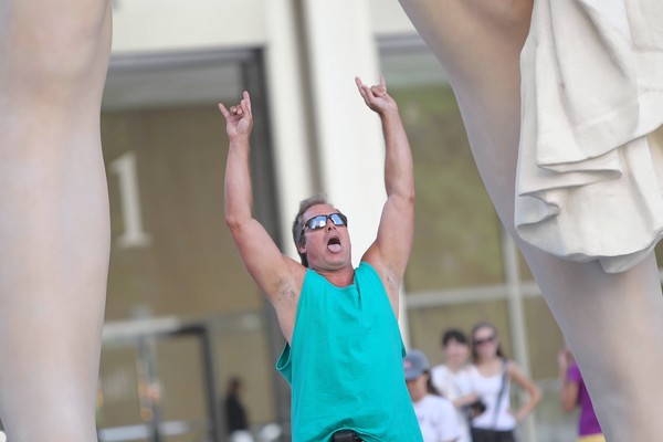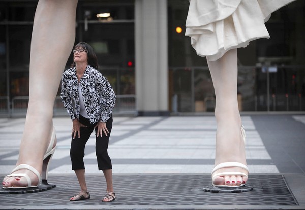 I presume this woman is attempting to recreate Marilyn’s famous pose — but without the skirt and with the regrettable side effect of looking like she’s about to relieve herself in the statue’s presence.